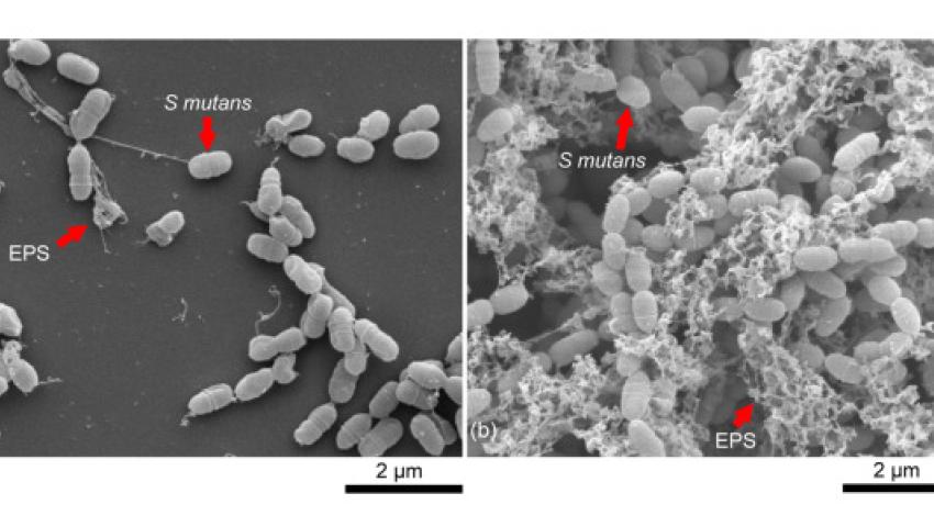 Biofilms consist of bacterial cells surrounded by a matrix of extracellular polymeric substance (EPS), which protects the colony from many countermeasures, including antibiotic treatments. Growth and formation of bacterial biofilms are affected by nutrients available in the environment. In the oral cavity, the presence of sucrose affects the growth of Streptococcus mutans that produce acids that erode enamel and form dental caries. Biofilm formation on dental implants commonly leads to severe infections and can restrict osseointegration necessary for the implant to be successful. This work determines the effect of sucrose concentration on biofilm EPS formation and adhesion of Streptococcus mutans, a common oral colonizer, to titanium substrates simulating common dental implants. Biofilm formation and profiles are visualized at high magnification with scanning electron microscopy (SEM). Large mounds and complex structures consisting of bacterial cells and EPS can be seen in biofilms at sucrose concentrations that are favorable for biofilm growth. The laser spallation technique is used to apply stress wave loading to the biofilm, causing the biofilm to delaminate at a critical tensile stress threshold. The critical tensile stress threshold is the adhesion strength. Because laser spallation applies the stress loading to the rear of the substrate, bulk adhesion properties of the biofilm can be determined despite the heterogenous composition and low cohesion strength of the biofilm. Statistical analysis reveals that adhesion strength of biofilms initially increase with increasing sucrose concentration and then decrease as sucrose concentration continues to increase. The adhesion strength of bacterial biofilms to the substrate in this study is compared to the adhesion of osteoblast-like cells to the same substrates published previously. When sucrose is present in the biofilm growth environment, S. mutans adhesion is higher than that of the osteoblast-like cells. Results of this study suggest sucrose-mediated S. mutans biofilms may outcompete osteoblasts in terms of adhesion during osseointegration, which could explain higher rates of peri-implant disease associated with high sugar diets. Further studies demonstrating adhesion differentials between biofilms and cells including co-cultures are needed and motivated by the present work.